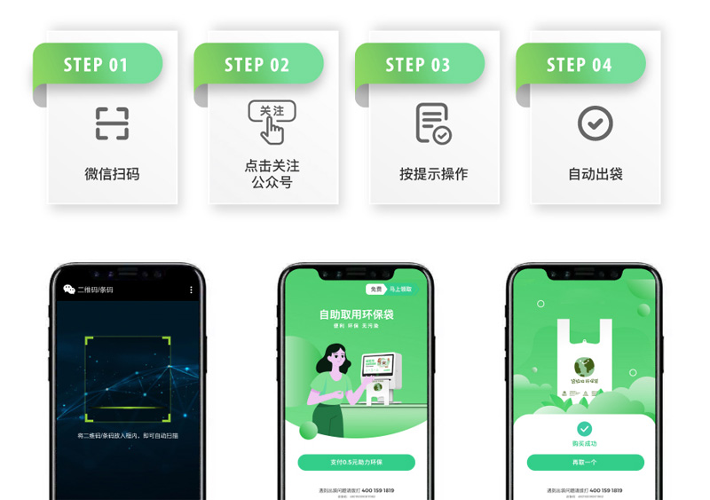 自助取袋機/環(huán)保袋發(fā)放機可以自助領(lǐng)取環(huán)保袋,居民可以免費領(lǐng),操作和無人自助售貨機一樣的。拿出手機掃碼一下二維碼,機器自動吐出環(huán)保袋。生活上對居民的出行提供了很大的便利,也通過免費領(lǐng)的方式增強了人們生活中綠色出行、低碳環(huán)保的意識。大尺寸的觸摸屏和環(huán)保袋同時也是廣告載體,能夠為各個區(qū)域商戶定制設(shè)計不同廣告,給人視覺感受。每一個機器和購物袋在使用過程中相當于人形廣告牌。